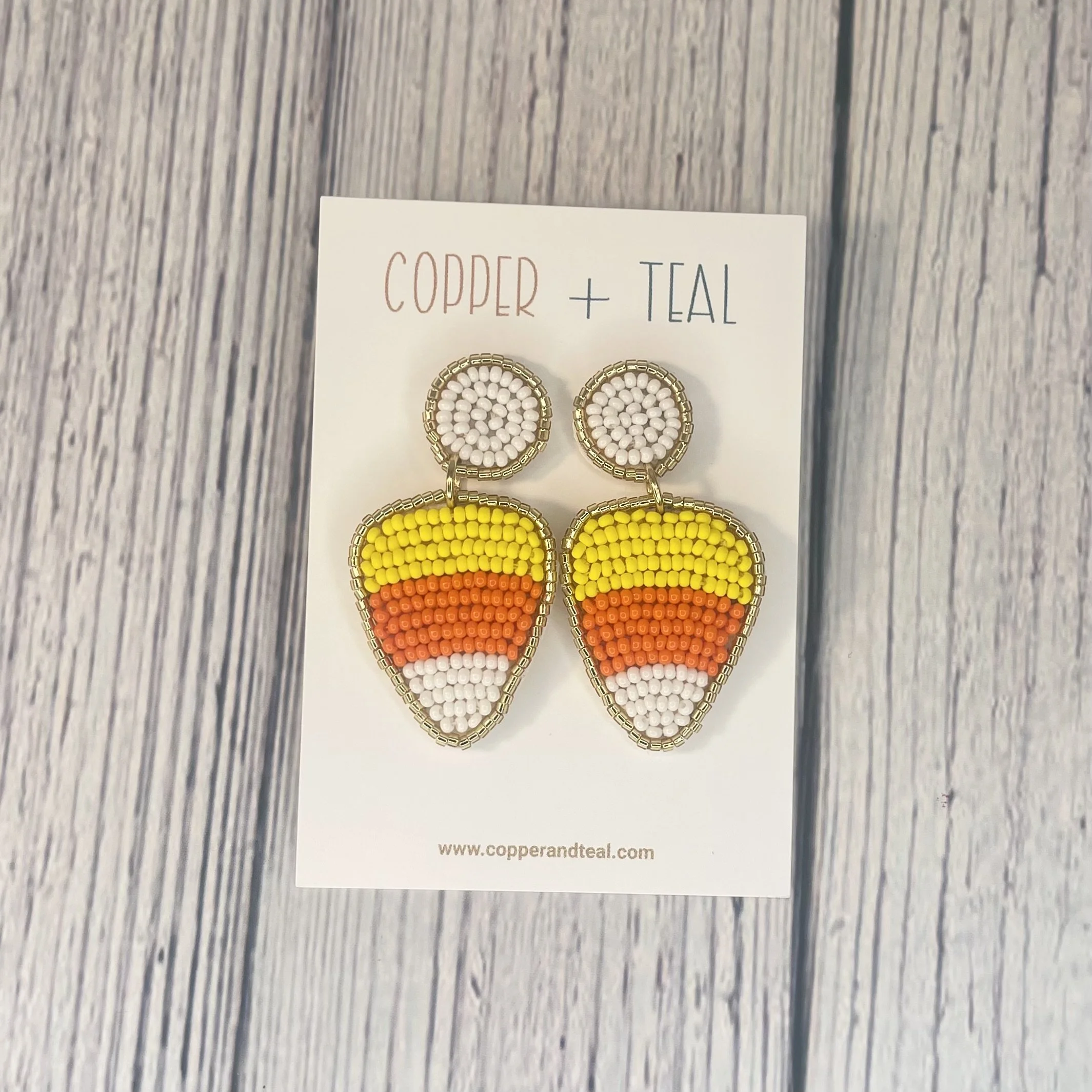 Beaded candy corn earrings with a matching white beaded stud. The perfect fall accessory or gift!