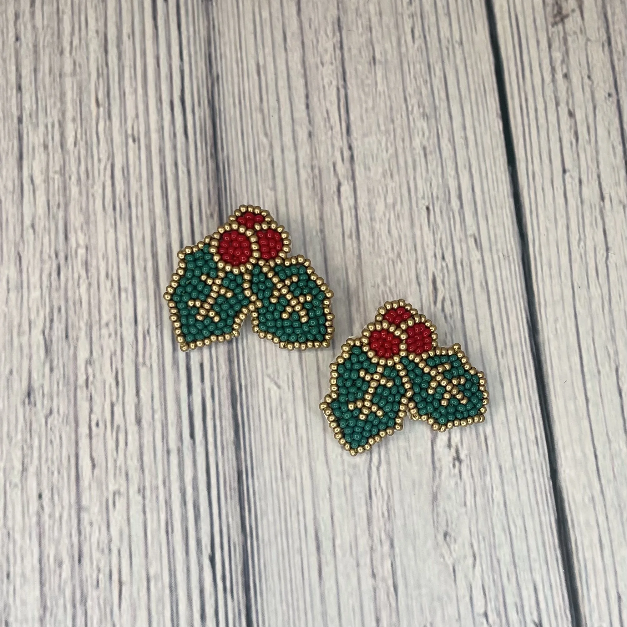 Beaded red and green Christmas holly earrings that hang straight from your ear with a hidden stud. The perfect holiday or birthday accessory or gift!
