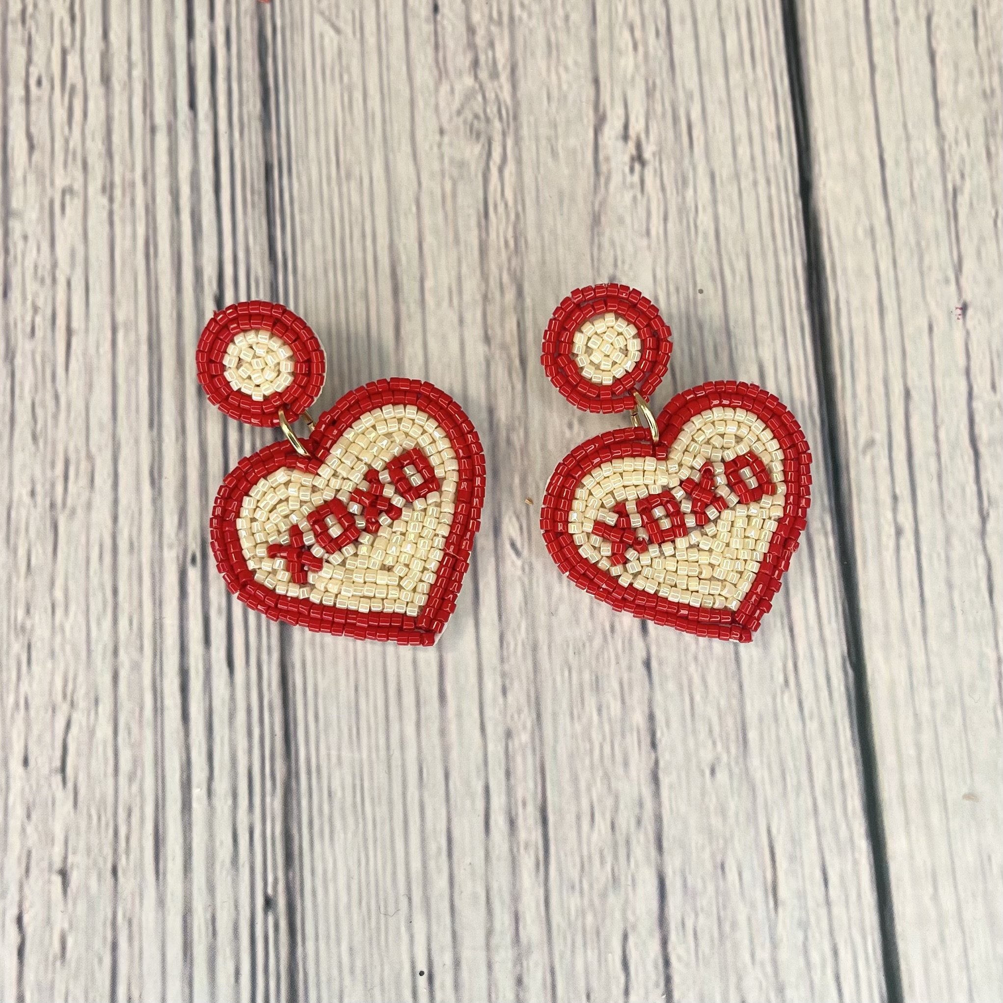 Beaded Shimmery Cream and Red XOXO Heart Earrings