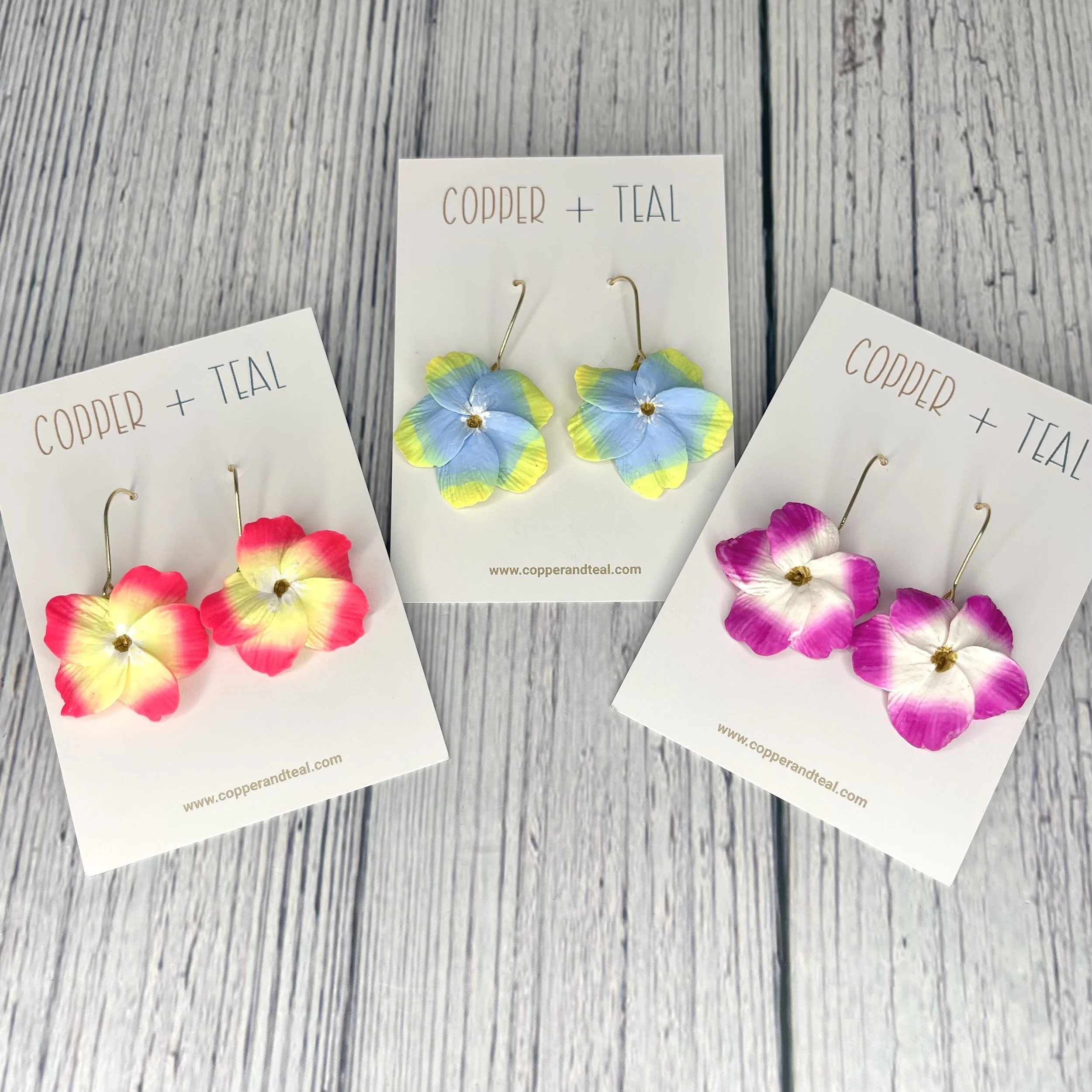 Dainty dangly earrings made from polymer clay "petals," available in multiple summery colors with contrasting petal tips. Super lightweight!