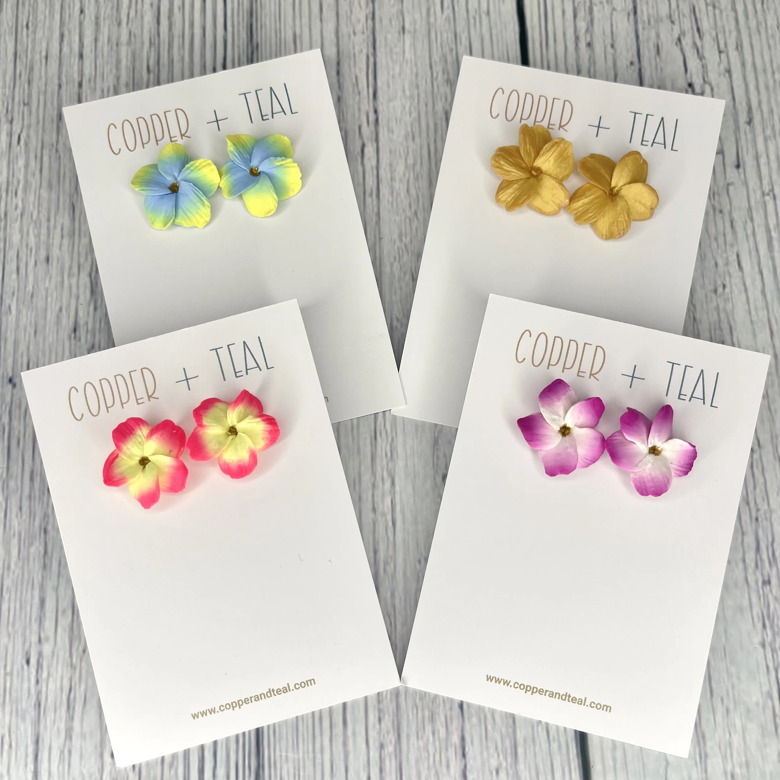 Pretty floral stud earrings made from polymer clay "petals," available in multiple colors with pretty contrasting tips.
